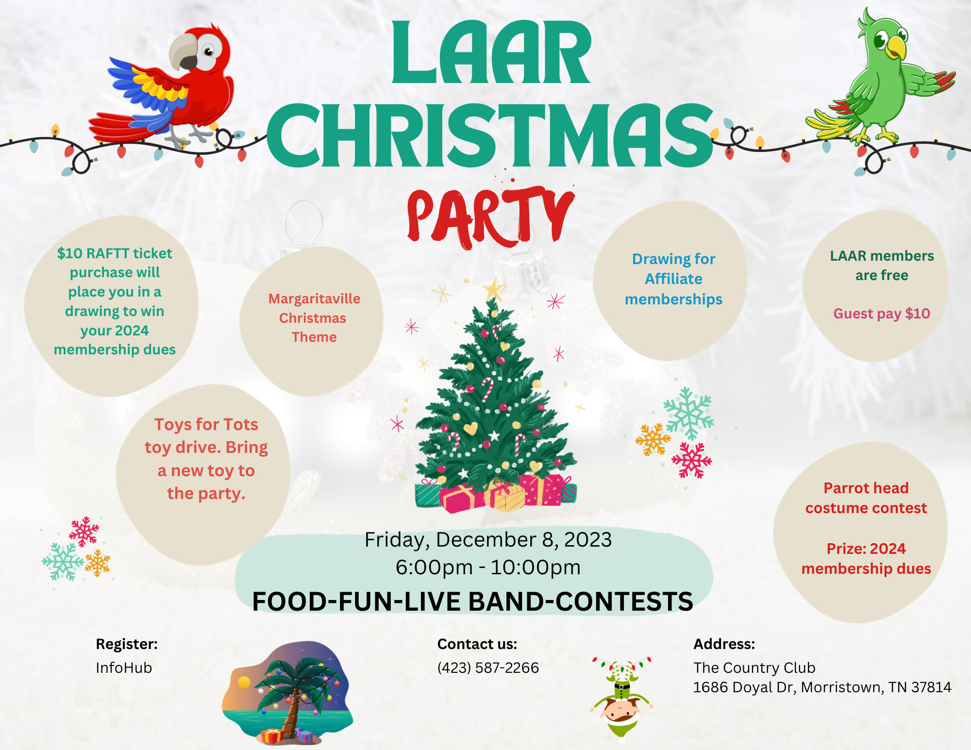 This year's theme is Margaritaville Christmas. There will be a Parrot head Costume contest. The winner of the contest will win their LAAR dues for 2024.