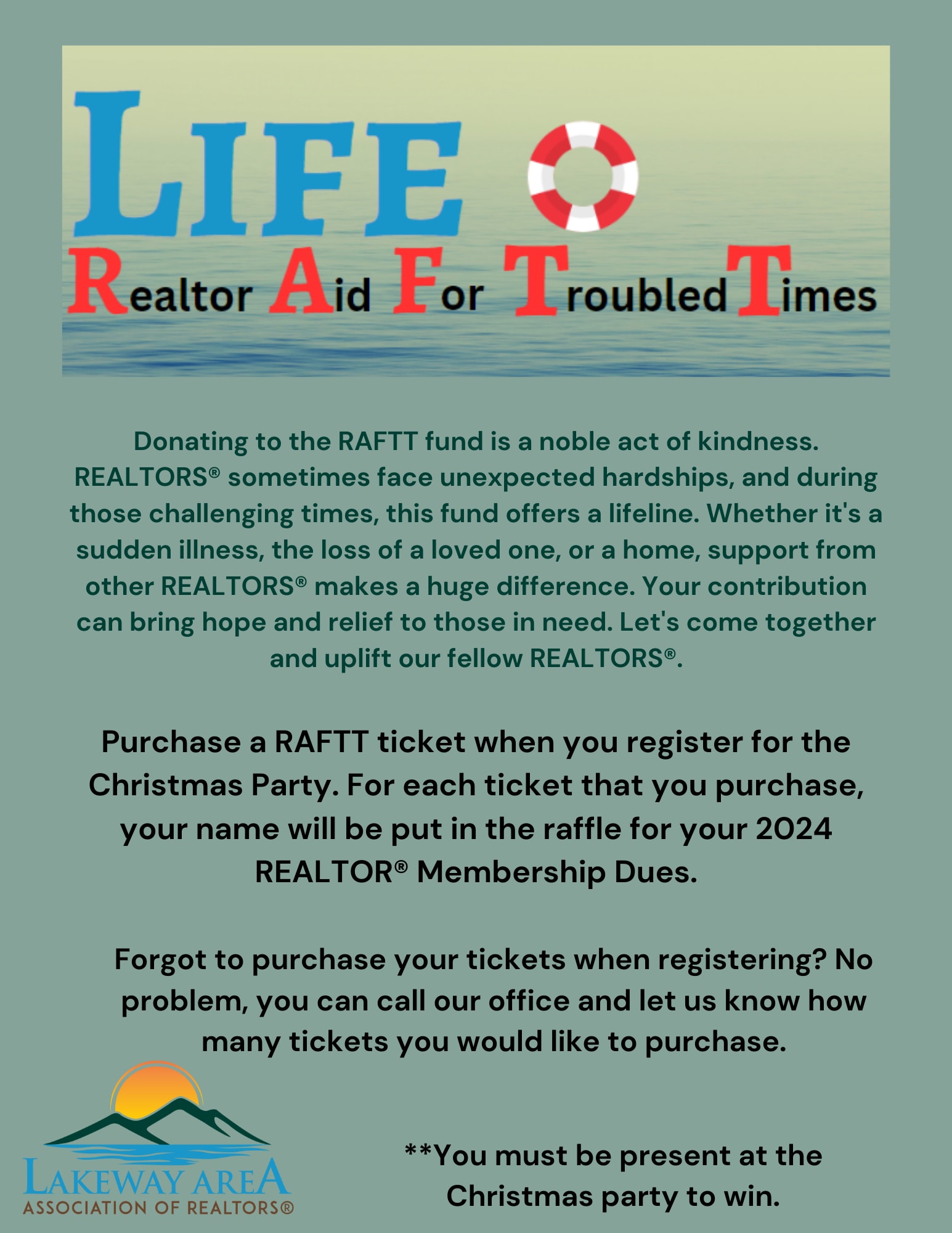 Members can purchase RAFTT raffle tickets to be entered into a drawing for 2024 membership dues. During the registration process you can choose how may tickets you would like. All proceeds go toward our RAFTT Fund (REALTOR® Aid for Troubled Times) which is a fund to help our members who have suffered a devastating event such as death of an immediate family member, loss of home due to fire, flooding, etc. You must be present to win.